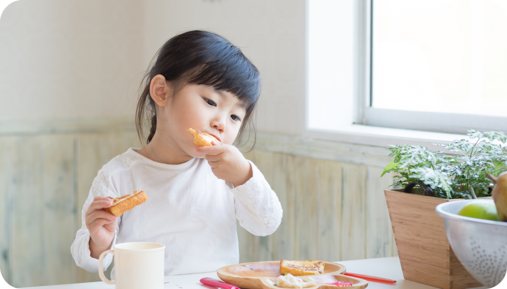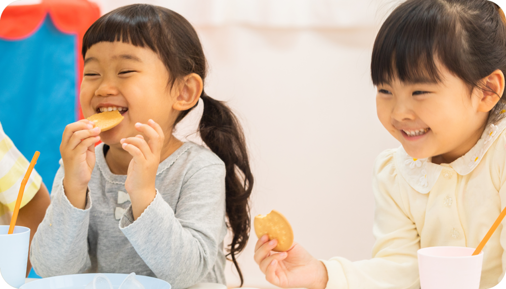 お楽しみの午前中のおやつの時間です。栄養バランスを考えたおやつを食べながら、エネルギーを補給します。