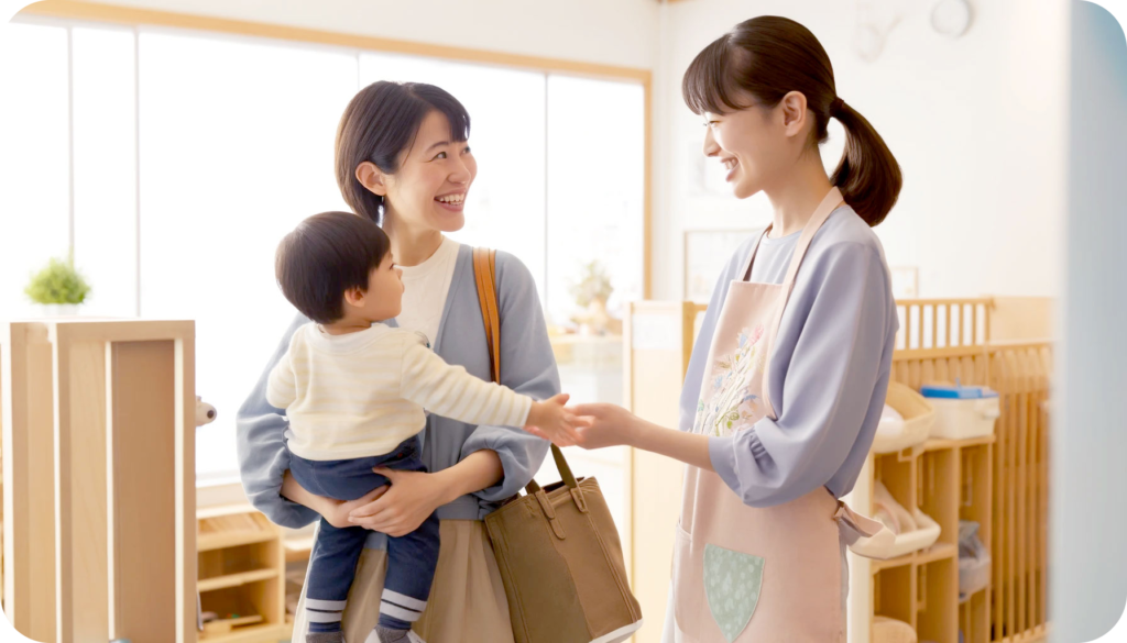 お迎えに来た保護者の方々に、今日の出来事や成長の様子をお伝えしながら子どもたちをお渡しします。